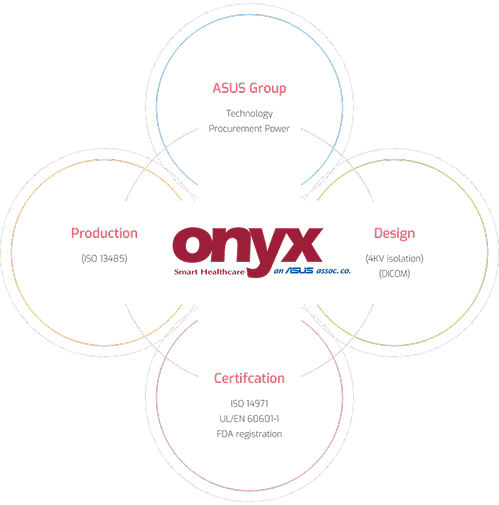 Onyx Healthcare is headquartered in Taiwan, with satellite offices in the Netherlands and California, and provides services to tier-1 medical instrument companies worldwide and as an NVIDIA Partner Network "NPN" Partner now. Onyx is a professional medical IT company in providing trusted, innovative products, customer-centric design services and medical pc solutions. Onyx cooperates closely with our partners to provide comprehensive medical products such as AI Ready Medical PC, Smart View Medical Stations, Fanless Slim Panel PC, Medical Display, Healthcare Infotainment, Mobile Tablet PC, Medical PC and Mobile Computing Cart, UPower Bank in the professional Hospital / Clinical IT market. Our products offer the advantages of filmless and paperless interaction in the hospital environment with certifications for ISO 13485, IEC/UL 60601-1, ISO 14971 risk management, and FDA registration. Product longevity is 7-10 years standard, with an optional extended 10-year support program. Onyx won notable awards such as the Taiwan Excellence Award / National Innovation Award / UK Best Medical AI Solutions Developer Award / Best Choice Award.