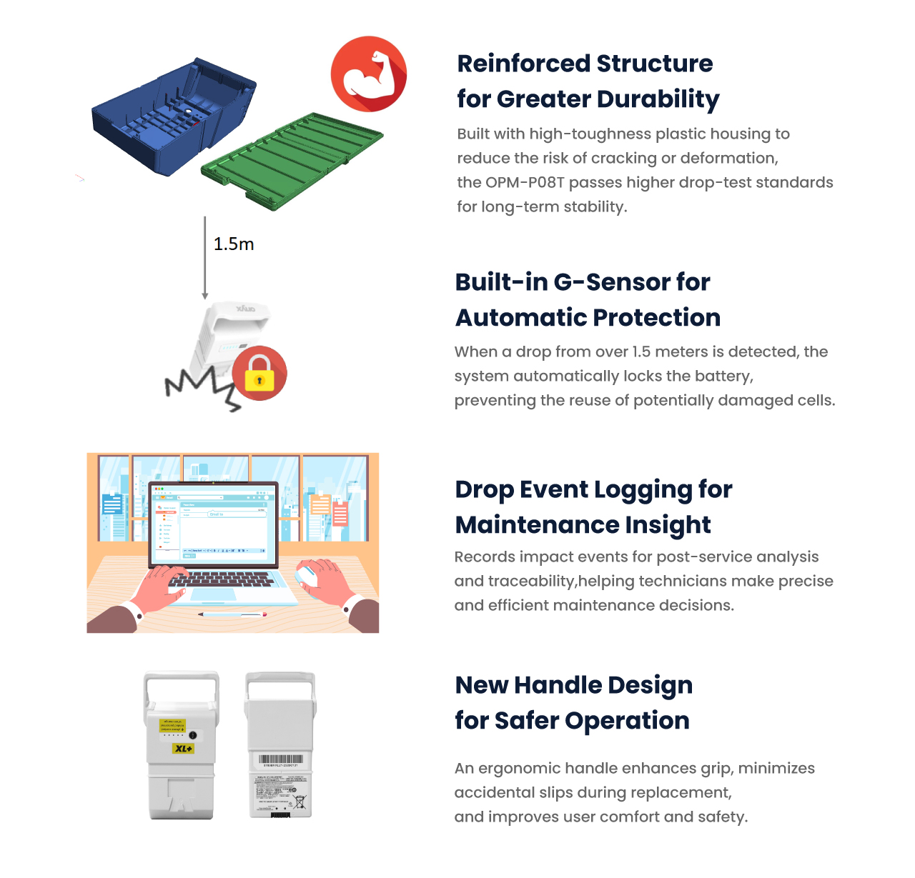 In clinical environments, the safety and durability of mobile medical device batteries are critical. To minimize drop-related risks and ensure long-term reliability, Onyx introduces the new OPM-P08T medical-grade Li-ion battery module, featuring reinforced construction, intelligent protection mechanisms, and user-friendly handling — designed to enhance reliability and safety for medical mobility devices.