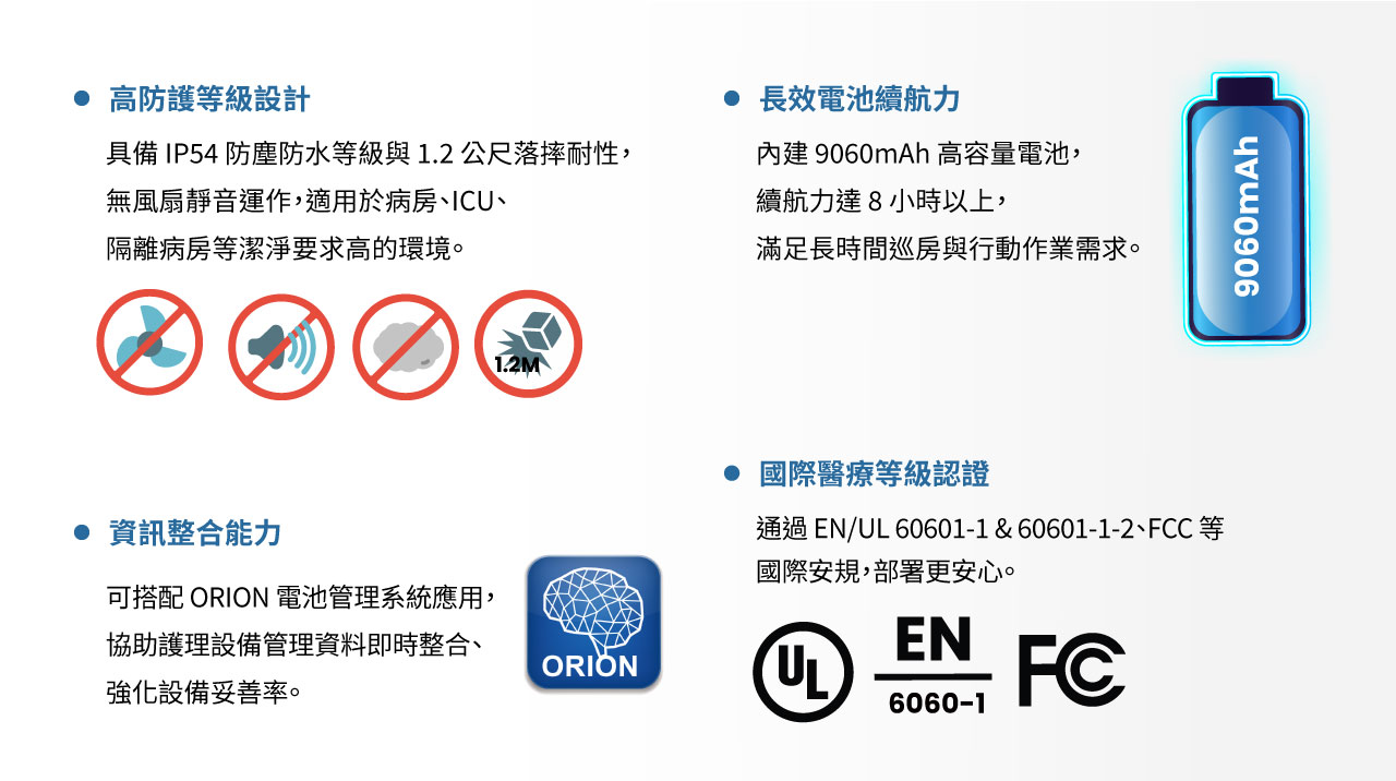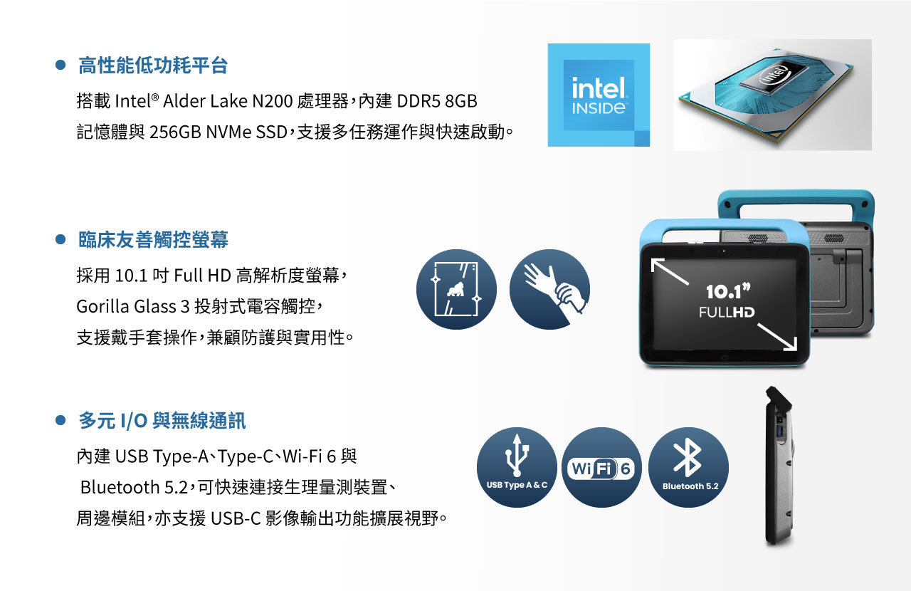 MD102N 結合高效平台、堅固結構與醫療級認證,為智慧醫療打造穩定、安全、可擴充的移動資訊解決方案,是您邁向無紙化、行動化照護的理想選擇!