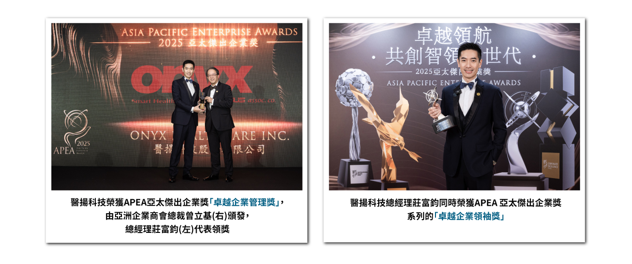 在 2025 年 亞太傑出企業獎(APEA, Asia Pacific Enterprise Awards),醫揚科技脫穎而出,榮獲 「卓越企業管理獎」,並由總經理莊富鈞先生獲頒 「卓越企業領袖獎」,雙料肯定彰顯 Onyx 在智慧醫療領域的卓越實力與國際競爭力。 APEA 被譽為亞太最具影響力的企業獎項之一,表揚在成長力、領導力與永續發展方面表現傑出的企業與領導人。本次獲獎不僅展現醫揚科技在醫療 AI 與醫療級電腦代工領域的深厚基礎,也進一步突顯 MIT(Made in Taiwan) 在全球醫療科技市場的創新價值。
